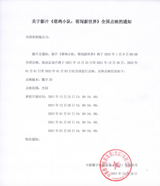 《萌鸡小队:萌闯新世界》全国点映的通知