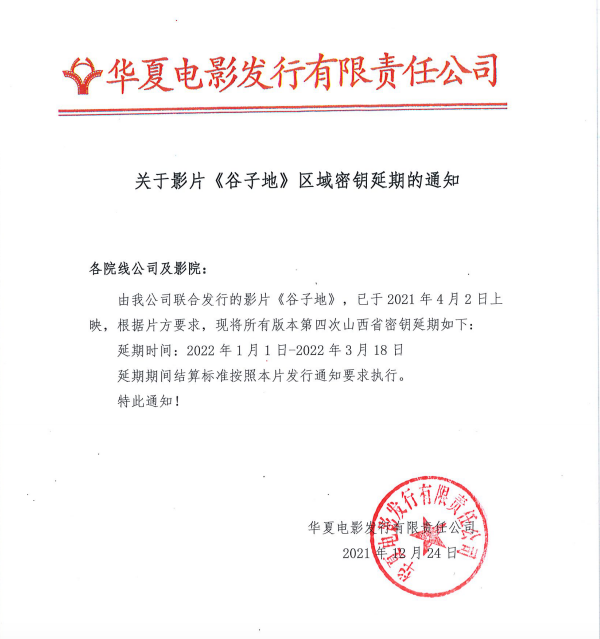 关于影片《谷子地》区域密钥延期的通知