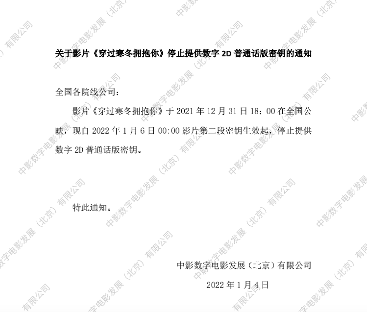发行通知 » 《穿越寒冬拥抱你》停止提供数字2D普通话版本密钥的通知