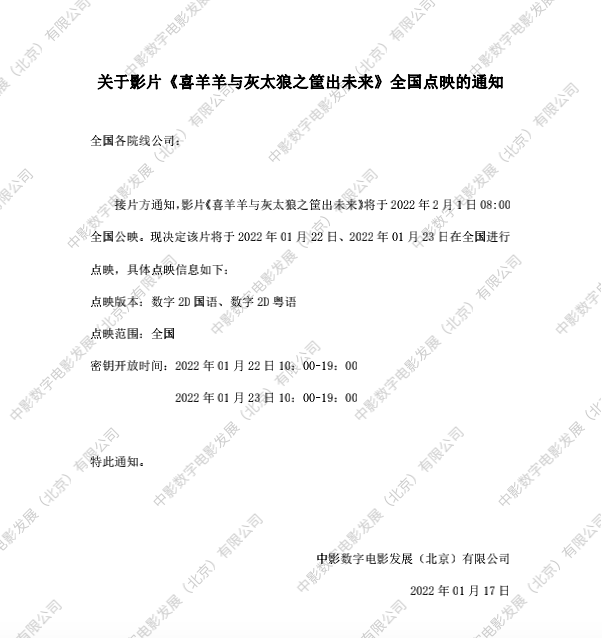 发行通知 » 《喜洋洋与灰太狼之筐出未来》全国点映的通知