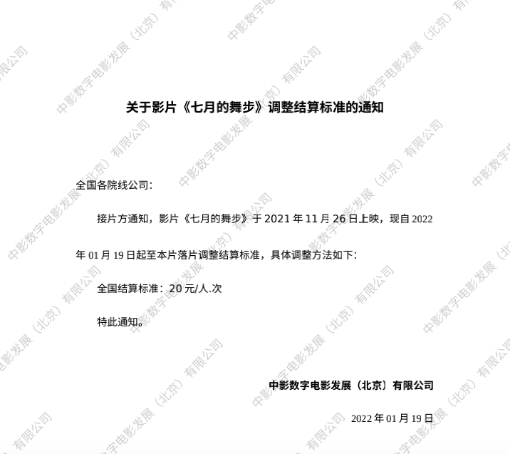 关于影片《七月的舞步》档期变更的通知