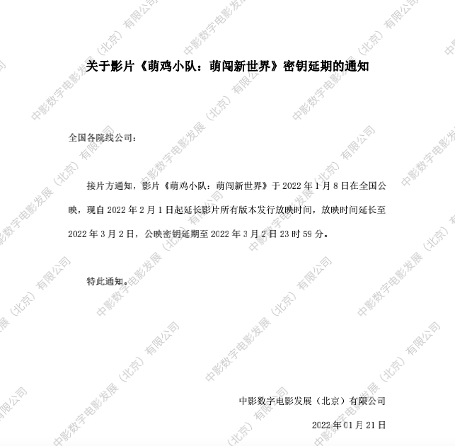 关于影片《萌鸡小队:萌闯新世界》撤档的通知