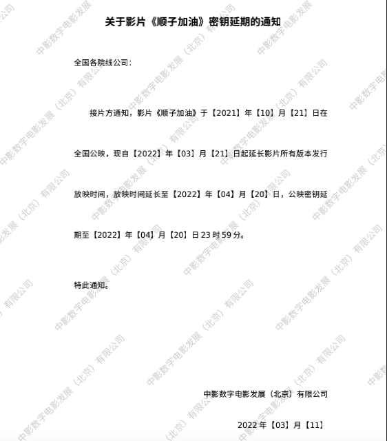 关于影片《顺子加油》第九次密钥延期的通知