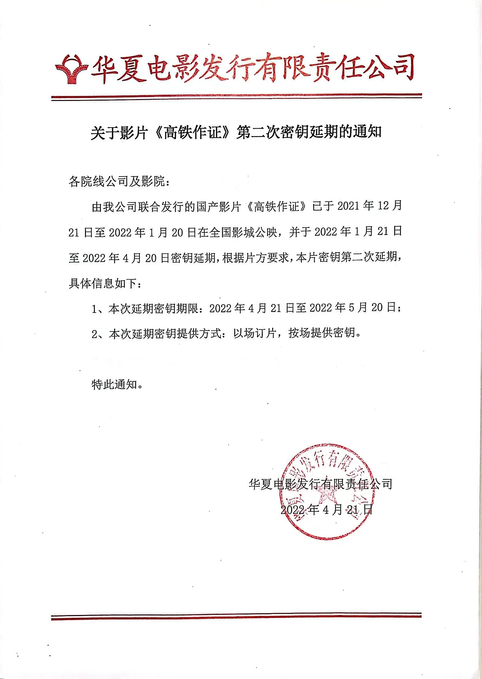《高铁作证》第十一次密钥延期的通知