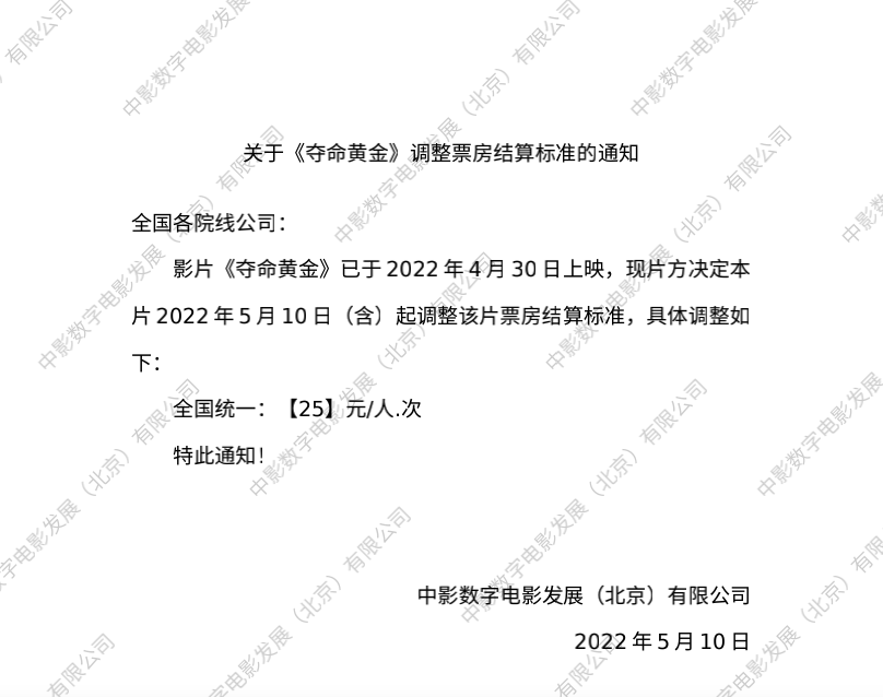 发行通知 » 《夺命黄金》调整票房结算标准的通知
