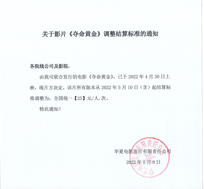 发行通知 » 《多名黄金》调整票房结算标准的通知