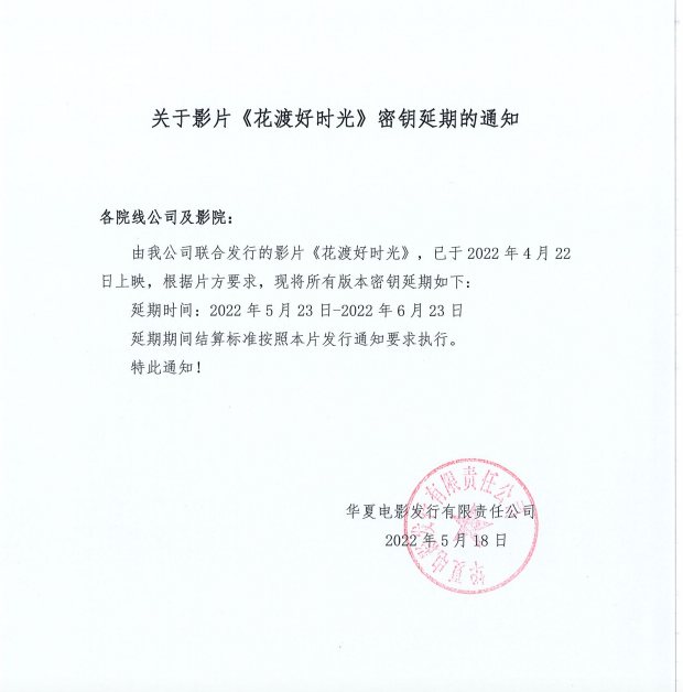 关于影片《花渡好时光》密钥延期的通知