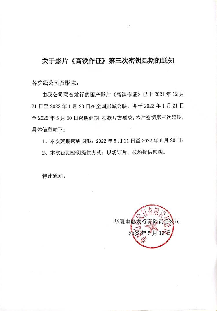 《高铁作证》第十三次密钥延期的通知