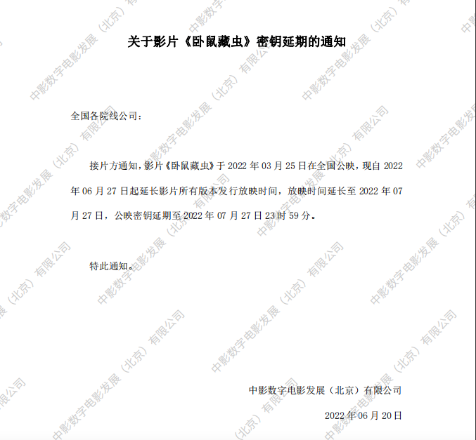 关于影片《卧鼠藏虫》第三次密钥延期的通知