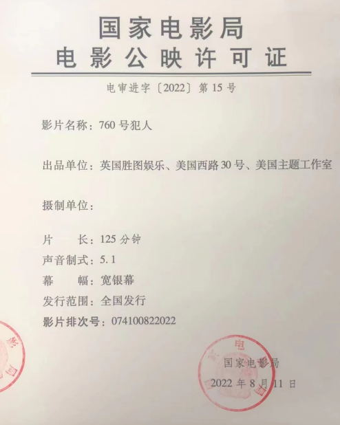 数字版影片《760号犯人》发行通知