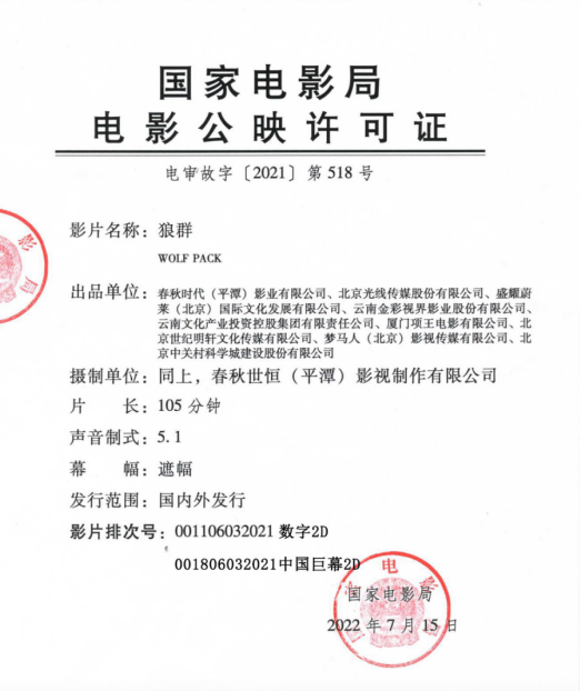 出 品:春秋时代(平潭)影业有限公司、北京光线传媒股份有限公司、盛耀蔚莱(北京)国际文化发展有限公司、云南金彩视界影业股份有限公司、云南文化产业投资控股集团有限责任公司、厦门项王电影有限公司、北京世纪明轩文化传媒有限公司、梦马人(北京)影视传媒有限公司、北京中关村科学城建设股份有限公司