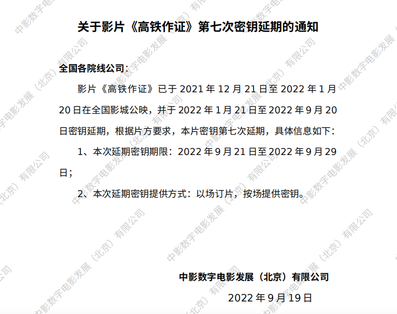 《高铁作证》第十三次密钥延期的通知