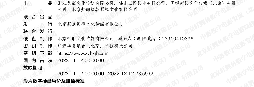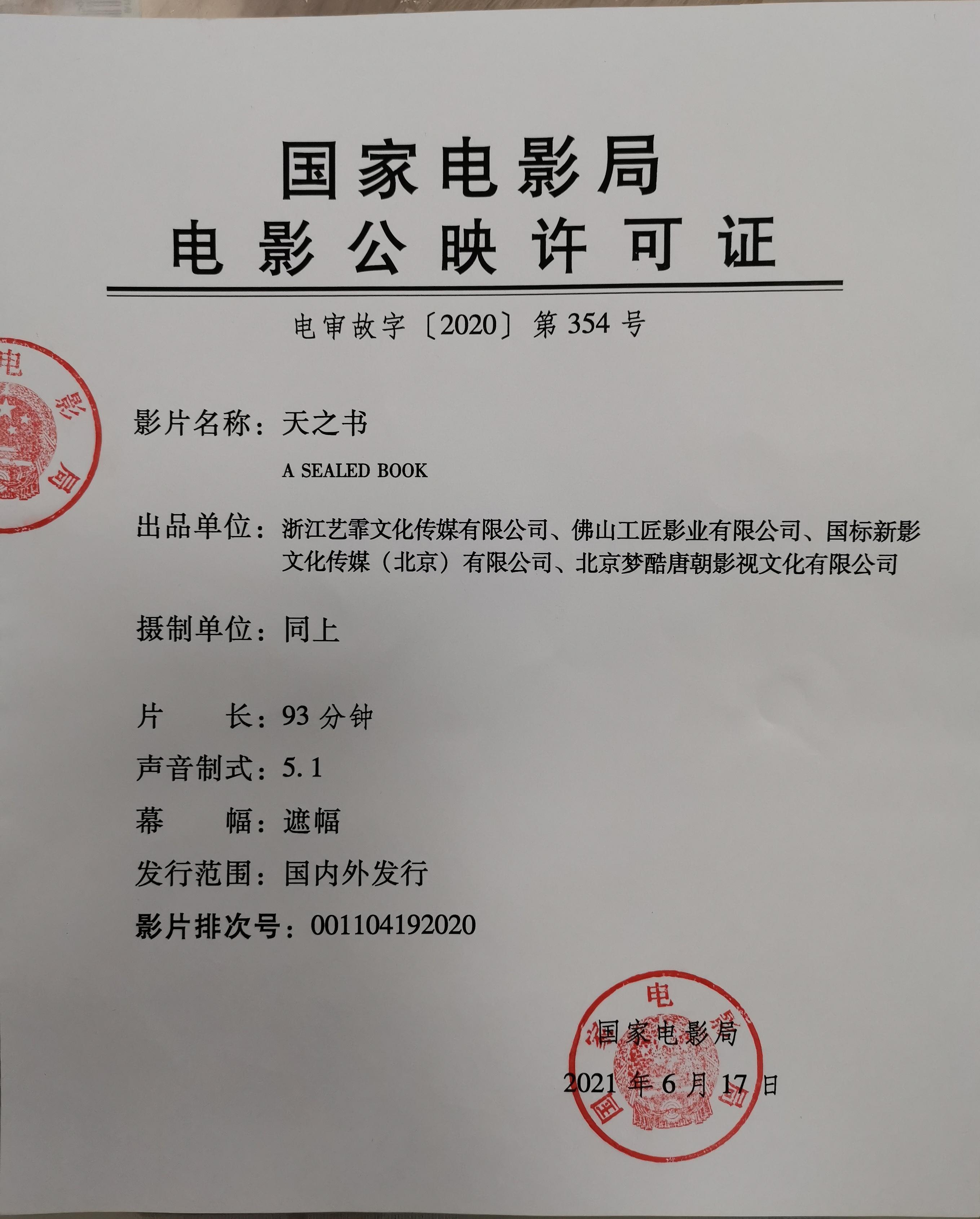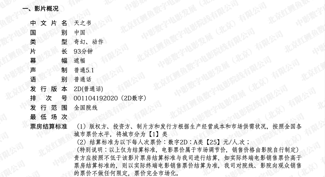 《天之书》密钥延期及调整票房结算标准的通知