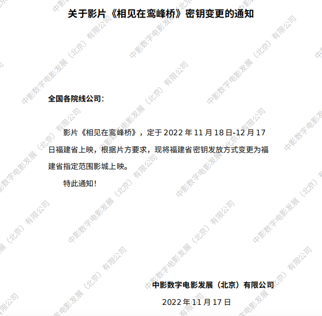 《相见在鸾峰桥》福建省密钥延期的通知