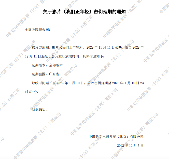 《我们正年轻》密钥延期的通知