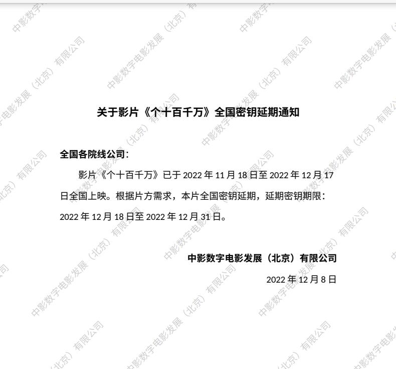致院线-关于影片《个十百千万》全国密钥延期通知