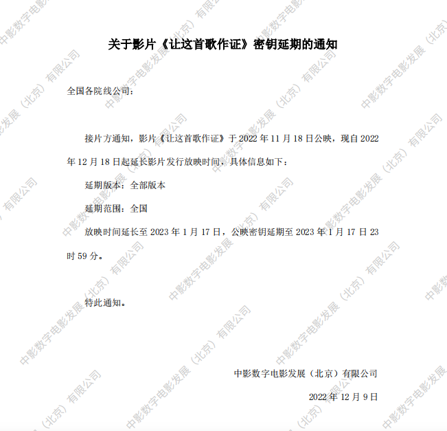 《让这首歌作证》第十四次密钥延期的通知