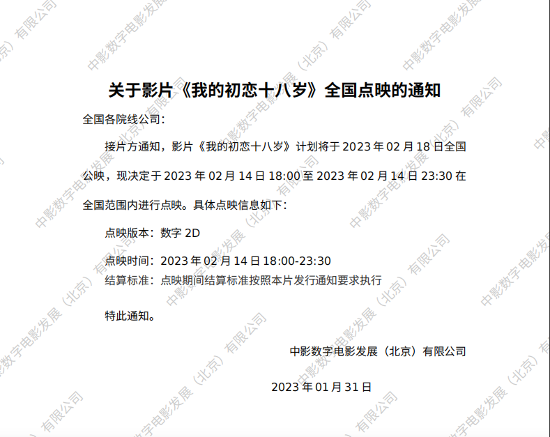 《我的初恋十八岁》全国点映的通知