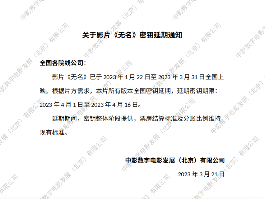 《无名》密钥延期及调整票房结算标准的通知