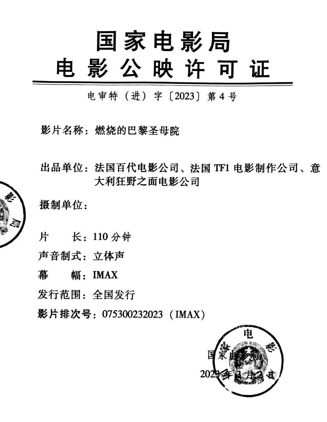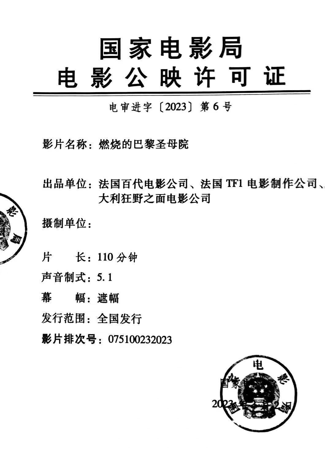 《燃烧的巴黎圣母院》发行通知