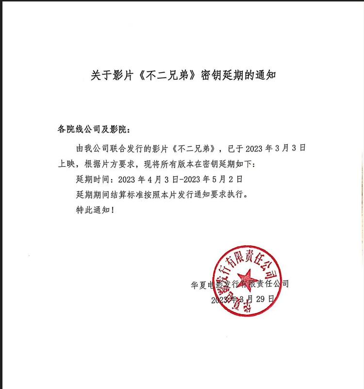 发行通知 » 关于影片《不二兄弟》密钥延期的通知