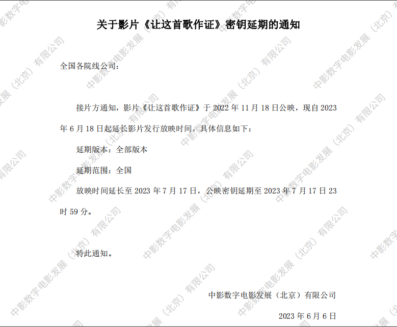 《让这首歌作证》第十四次密钥延期的通知
