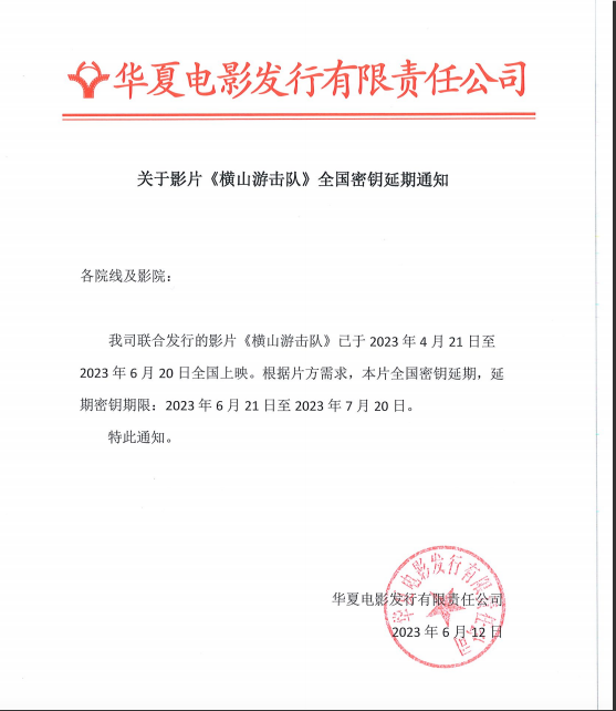 关于影片《横山游击队》全国密钥延期通知