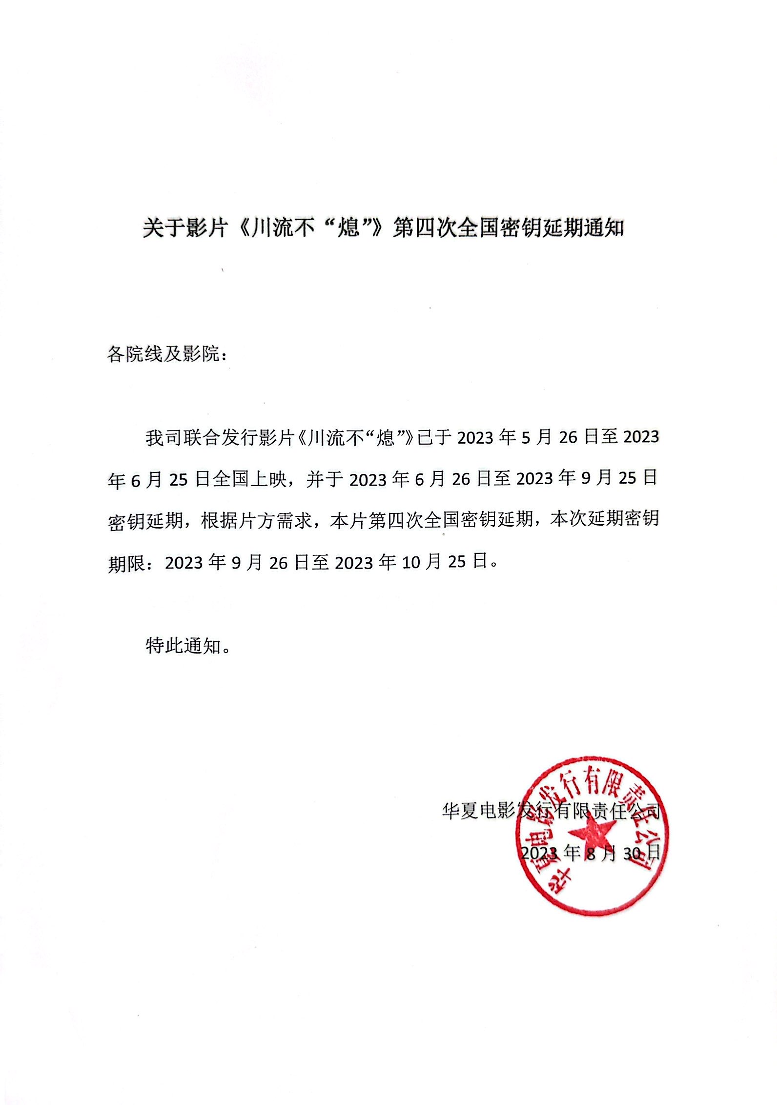 关于影片《川流不“熄”》第十一次全国密钥延期通知