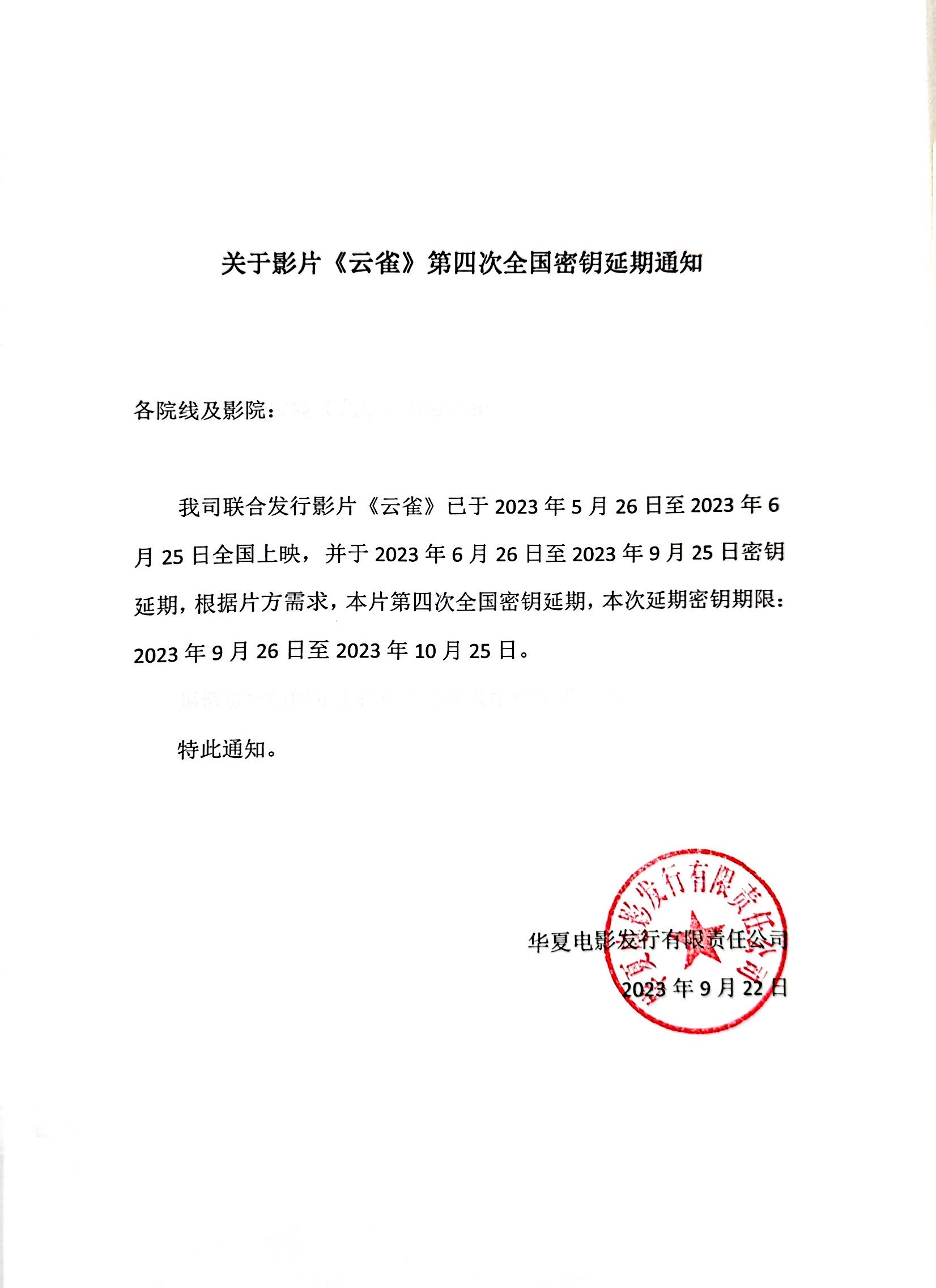 发行通知 » 《云雀》第四次全国密钥延期的通知