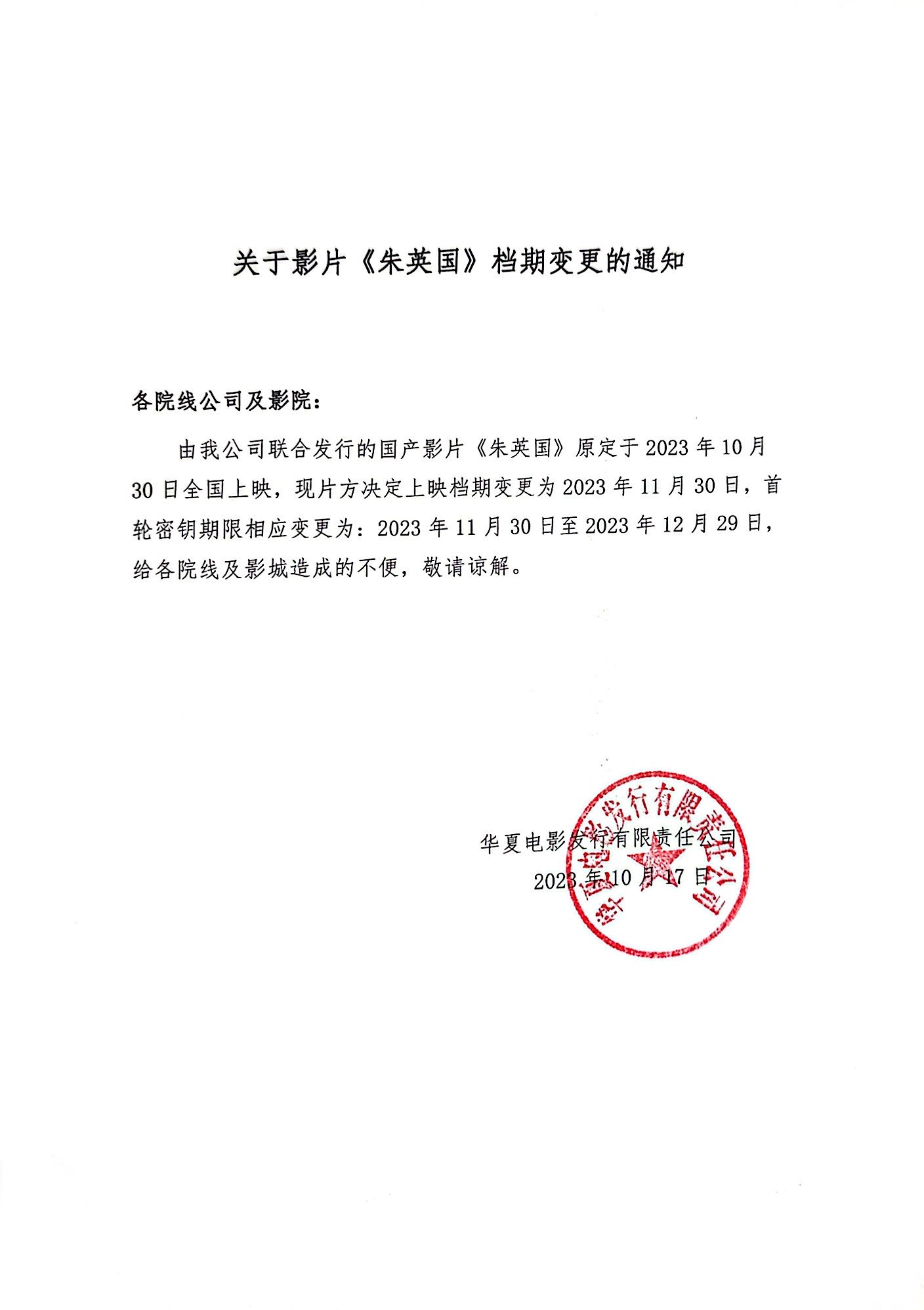《朱英国》第二次档期变更的通知
