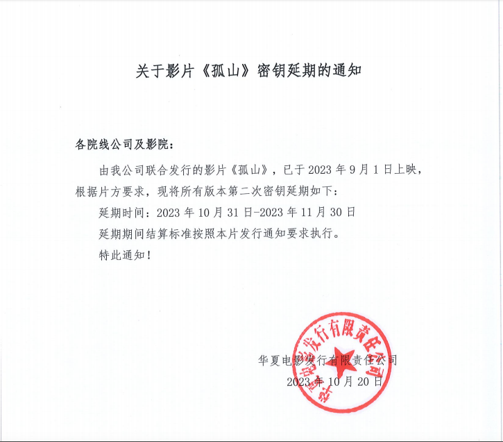 关于影片《孤山》第四次密钥延期的通知