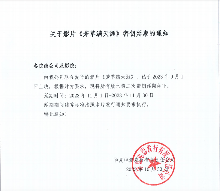 关于影片《芳草满天涯》第四次密钥延期的通知