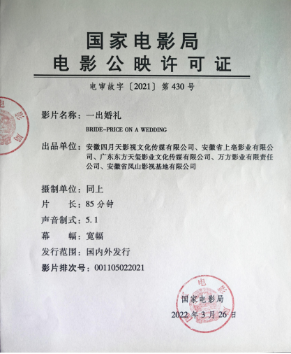 出 品:安徽四月天影视文化传媒有限公司、安徽省上毫影业有限公司、广东东方天玺影业文化传媒有限公司、万方影业有限责任公司、安徽省凤山影视基地有限公司