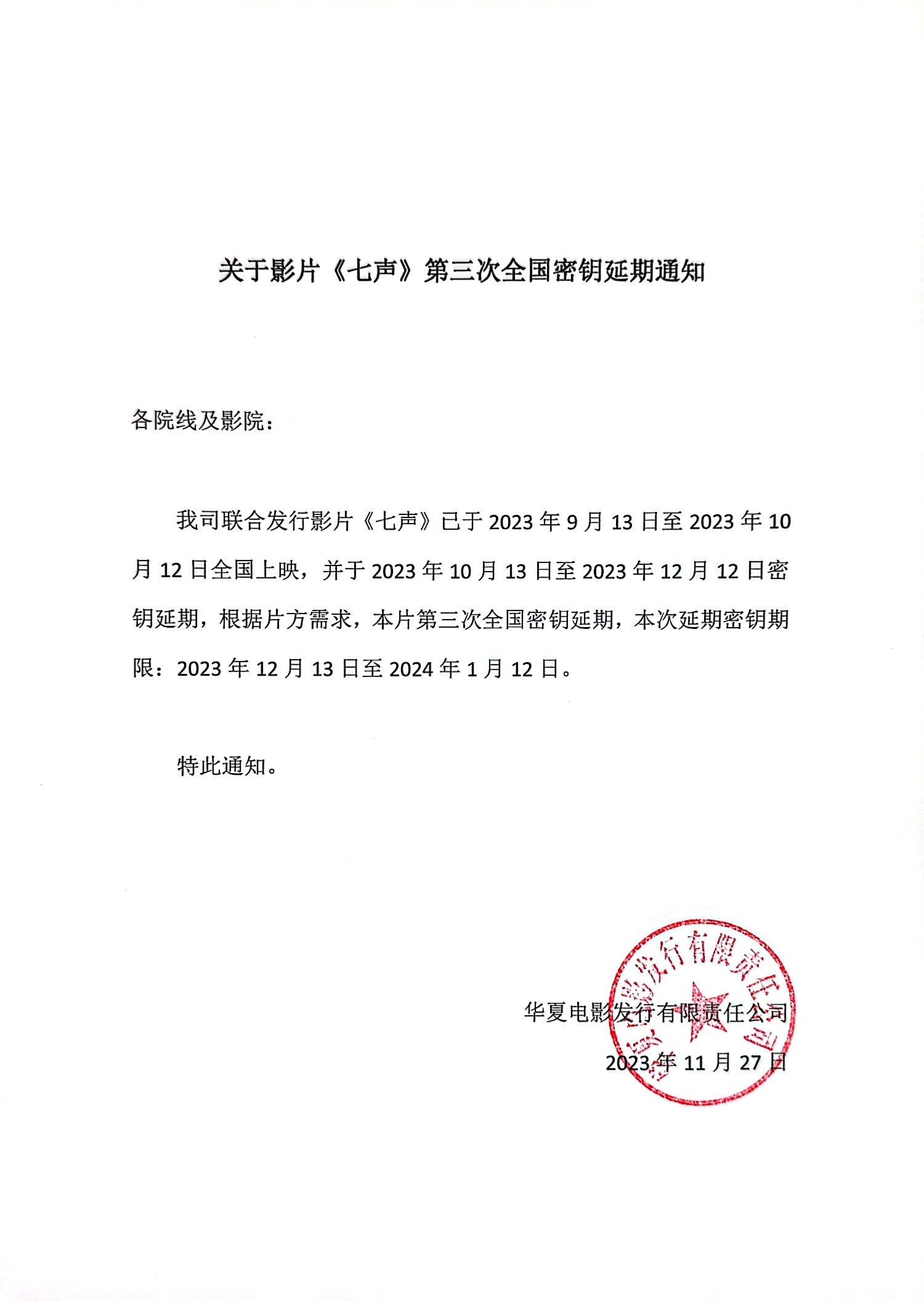 《七声》第十一次全国密钥延期的通知