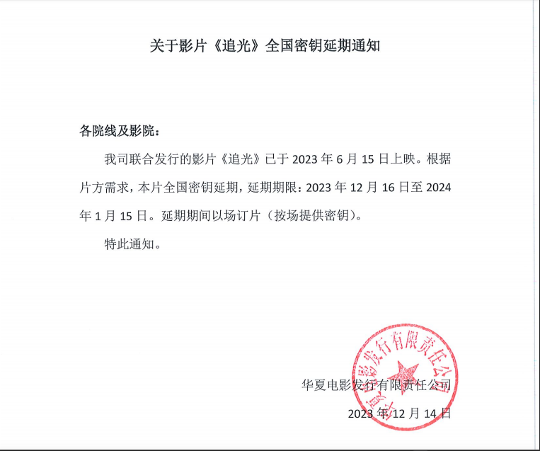 关于影片《追光》全国密钥延期通知