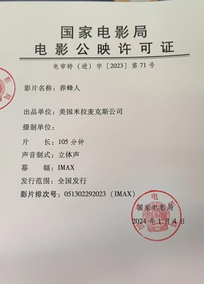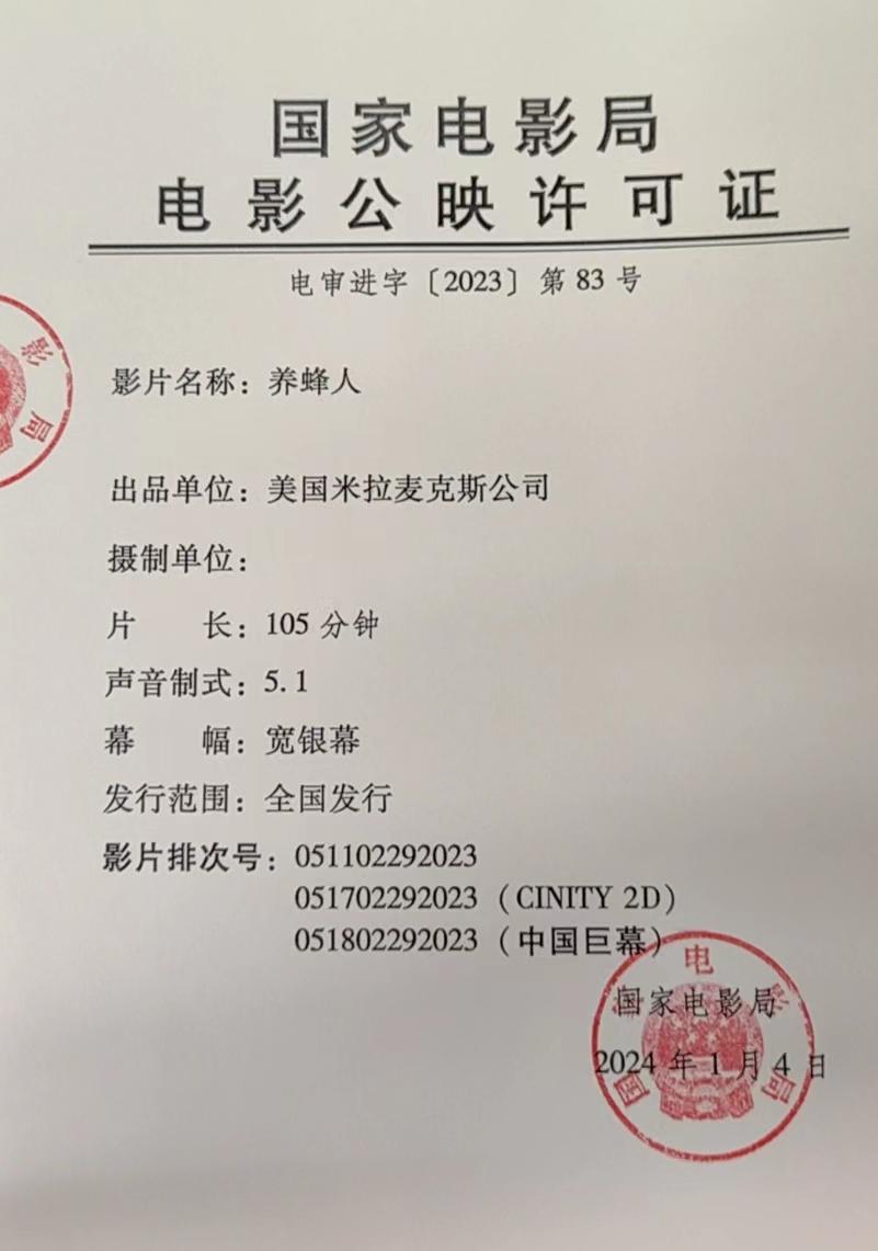 《养蜂人》发行通知(延期)