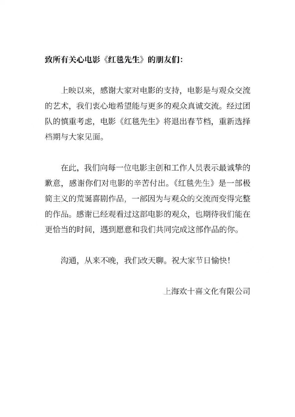 接片方通知,红毯先生因档期调整,将撒出春节档,新档期待定,将开启退票工作,给影院造成不便,敬请谅解。密钥有效期至2024年2月18日23点59分:59分,