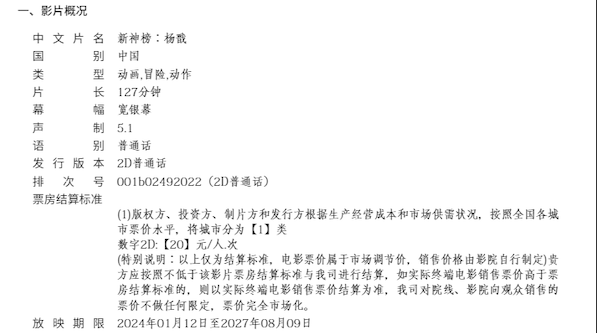 《新神榜:杨戬》调整票房结算标准的通知