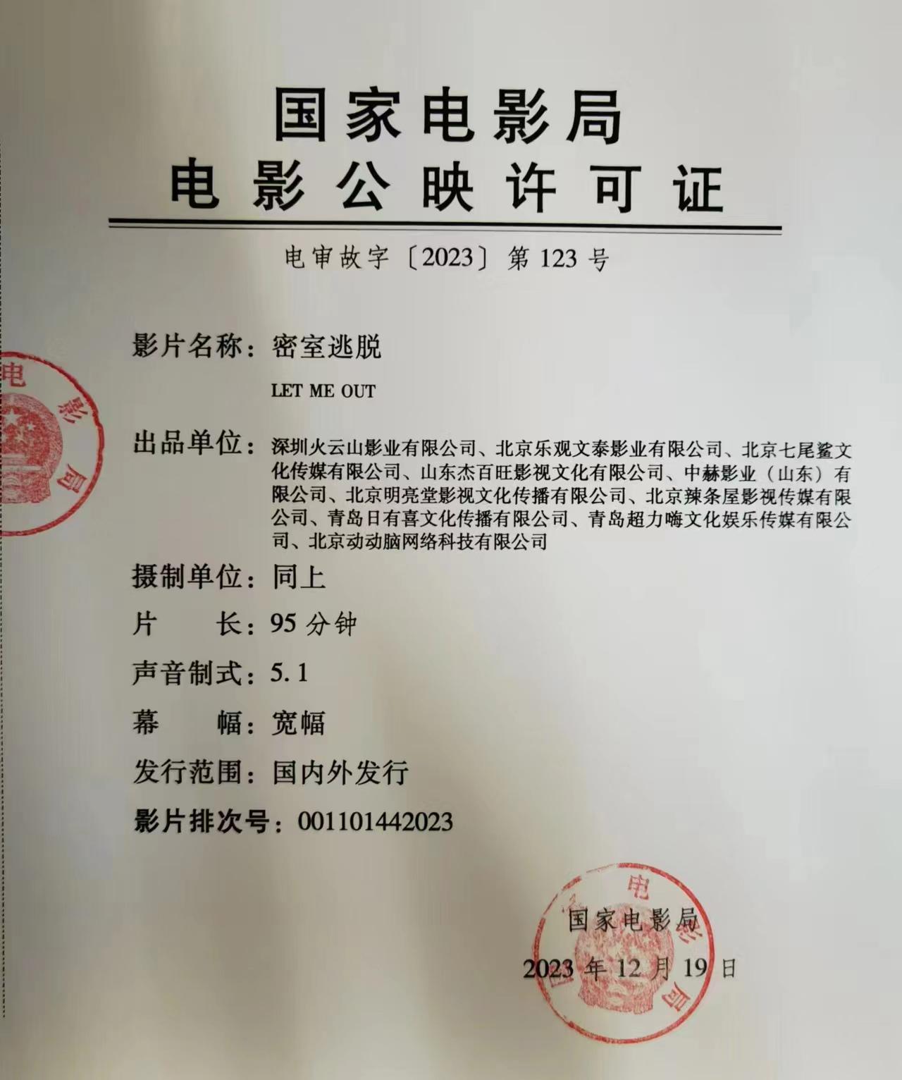 《密室逃脱》调整票房结算标准的通知