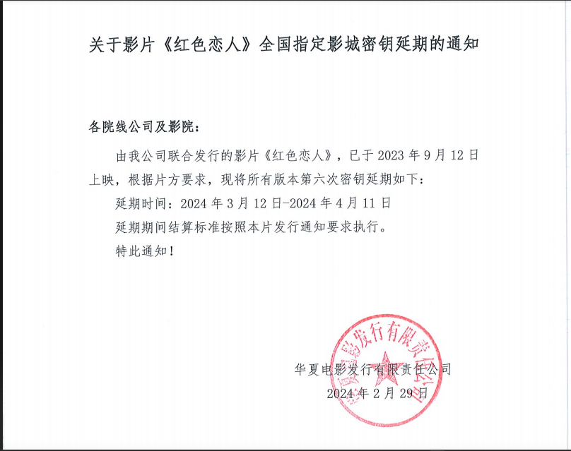 《红色恋人》全国指定影城密钥延期的通知