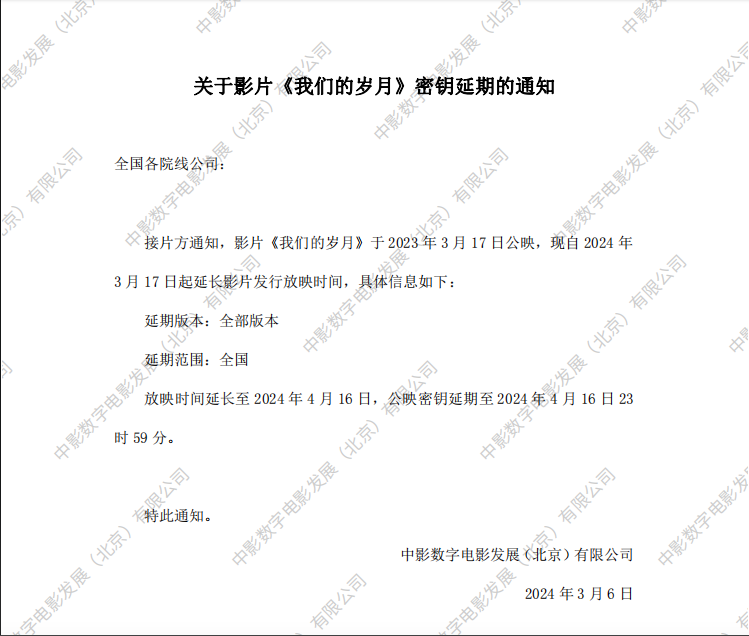 《我们的岁月》第十五次密钥延期的通知