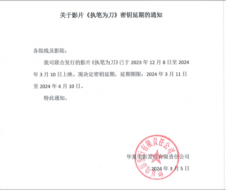 关于影片《执笔为刀》密钥延期的通知