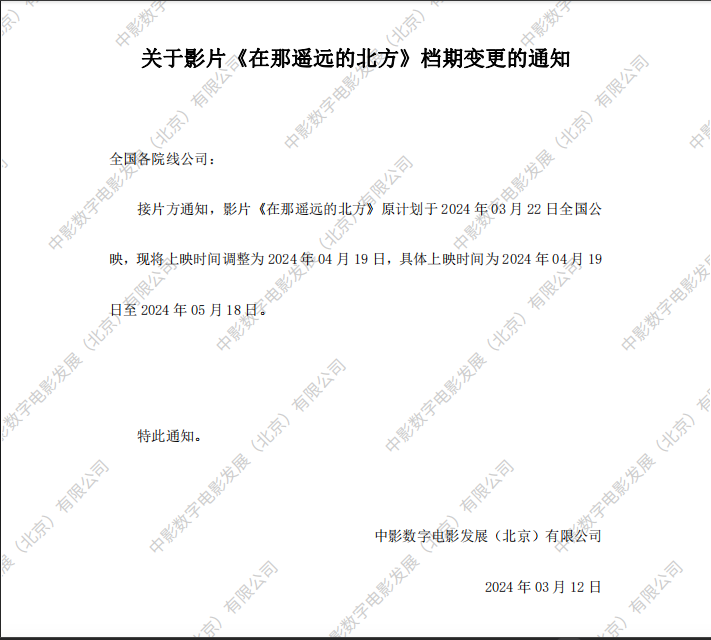 《在那遥远的北方》档期变更的通知
