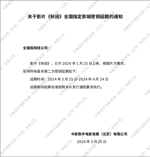《秋田》全国指定影城密钥延期的通知