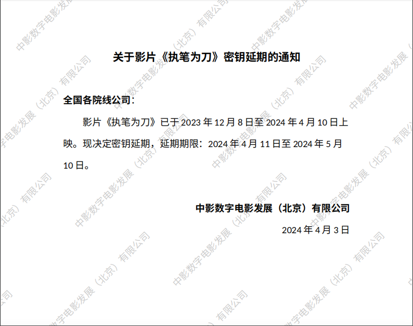 关于影片《执笔为刀》密钥延期的通知