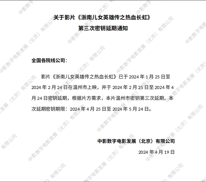 关于影片《浙南儿女英雄传之热血长虹》第九次密钥延期通知