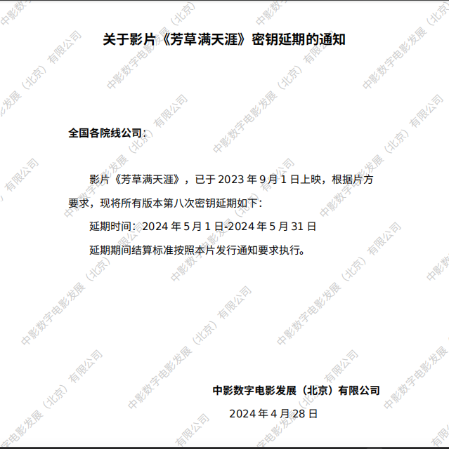 关于影片《芳草满天涯》第四次密钥延期的通知