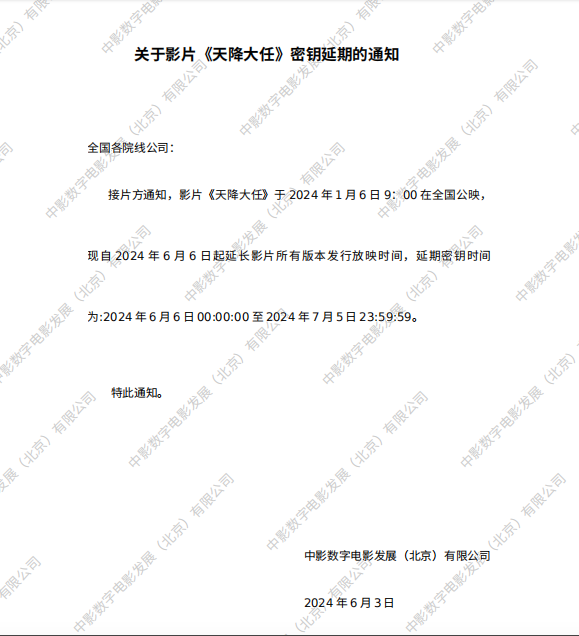 《天降大任》第十次密钥延期的通知