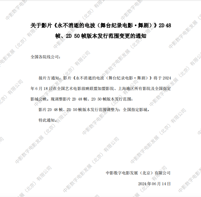 发行通知 » 《永不消逝的电波(舞台纪录电影·舞剧)》2D 48 帧、2D 50 帧版本发行范围变更的通知