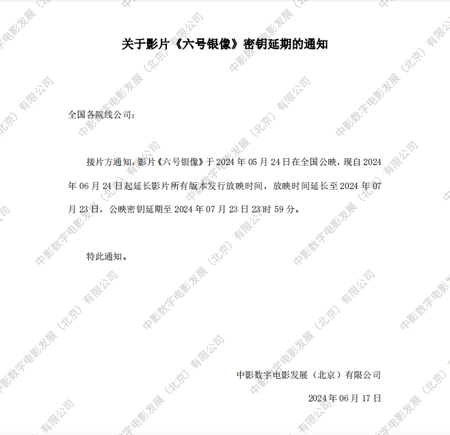 《六号银像》第二次密钥延期的通知